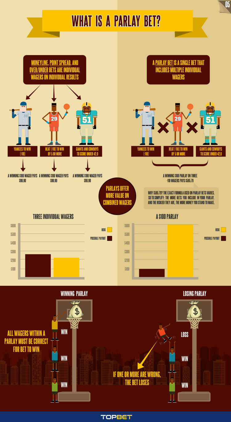 A parlay bet is a bet with at least two wagers made within it. If any of the wagers within a parlay are losers, the bet is a loser. If all wagers within the bet are winners, you win a multiplied payout.